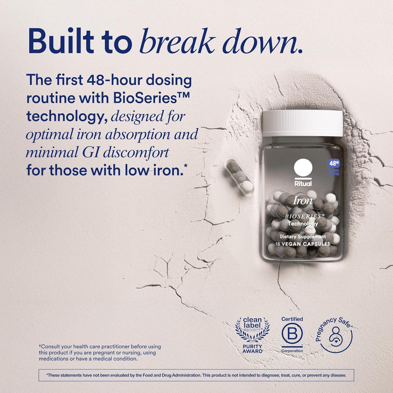 INGREDIENTS: Ritual Iron BioSeriesTM contains an alternate-day dose of 60 mg bioavailable iron as ferrous bisglycinate, formulated to release gradually over 6 hours, and includes Vitamins A and C to support Iron absorption. Essential for Women 18+ to support foundational health needs with key nutrients such as Omega-3 DHA and methylated B12 for brain health and Vitamin D, and Boron for bone health, plus blood-building methylated Folate.*