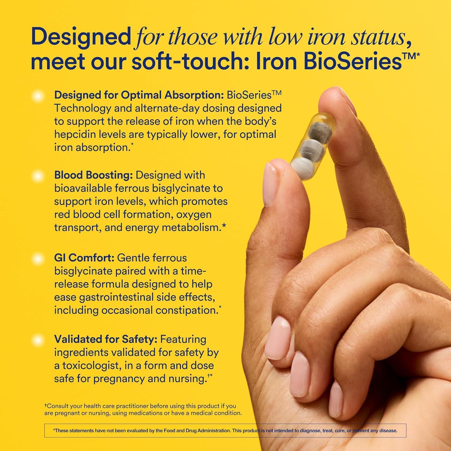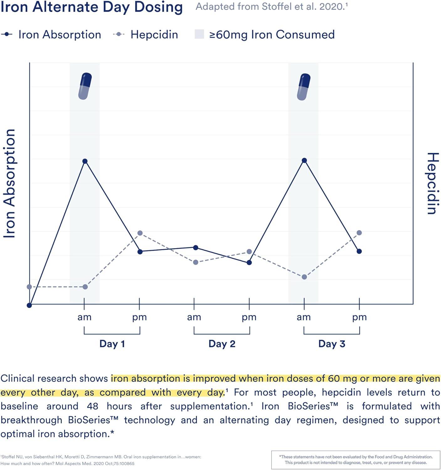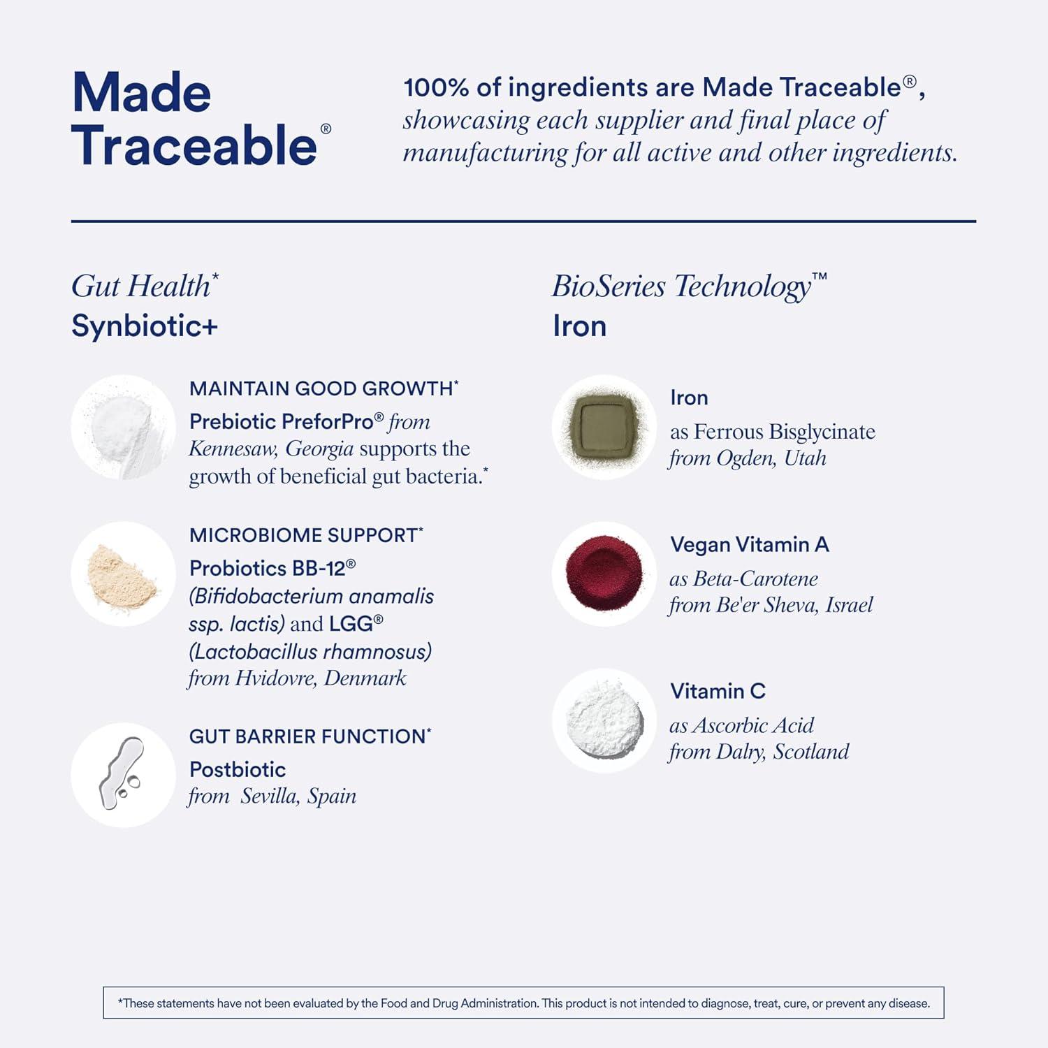 INGREDIENTS: Ritual Iron BioSeriesTM is designed with an alternate-day dose of 60 mg bioavailable iron as ferrous bisglycinate, formulated to release gradually over 6 hours, and includes Vitamins A and C to support Iron absorption. Synbiotic+ contains probiotic strains LGG & BB-12 to support healthy regularity as well as relief of occasional discomforts such as mild and occasional bloating, gas, and diarrhea, as well as pre and postbiotic strains.*