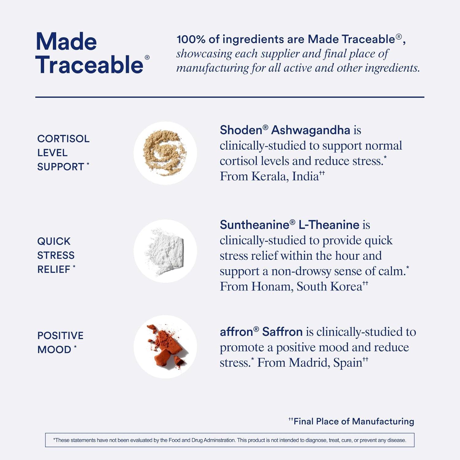 MADE TRACEABLE: with Ashwagandha from Kerala, India, L-Theanine from Honam, South Korea, and Saffron from Madrid, Spain.*